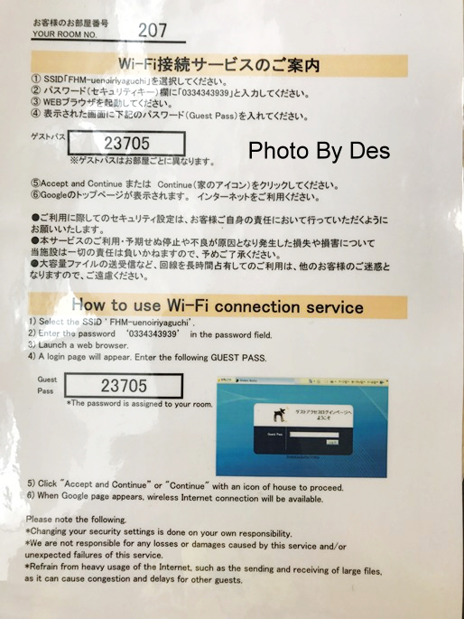 - 本旅館設有免費WiFi服務,請參照另一張WiFi密碼紙連接上網。