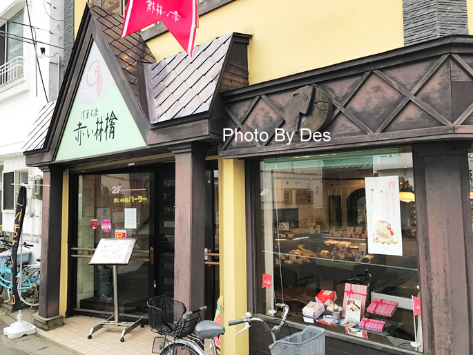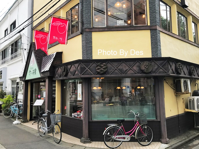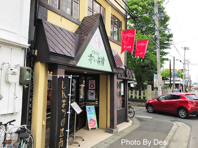 「善知鳥神社」的正殿大門口旁邊,就是「赤い林檎」洋菓子店