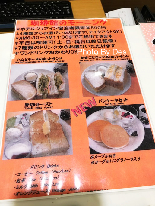 「VIA INN HIROSHIMA」櫃台人員拿出2張早餐菜單給咱們看